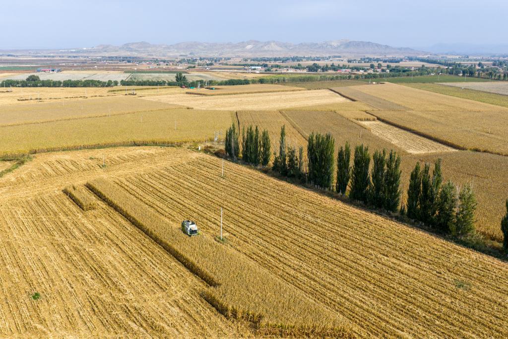 2025年10月15日,在内蒙古巴彦淖尔市乌拉特前旗,农民驾驶农机收割玉米。