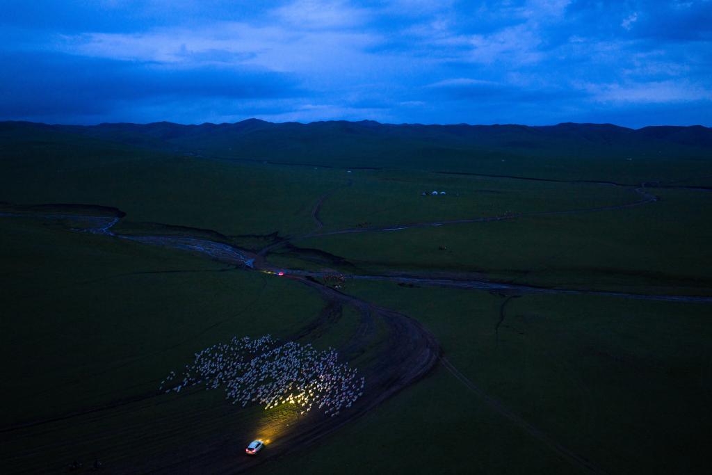 2025年6月14日,前往夏营地的牧民在阿鲁科尔沁草原上驱赶羊群赶夜路。