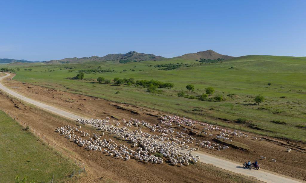 2025年6月14日,在内蒙古赤峰市阿鲁科尔沁旗,前往夏营地的牧民们骑摩托车赶羊。