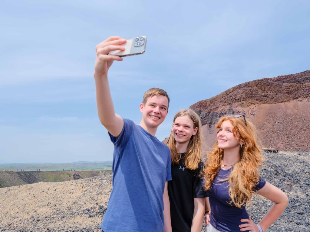 2025年6月17日,三名美国游客在乌兰哈达火山地质公园6号火山合影。
