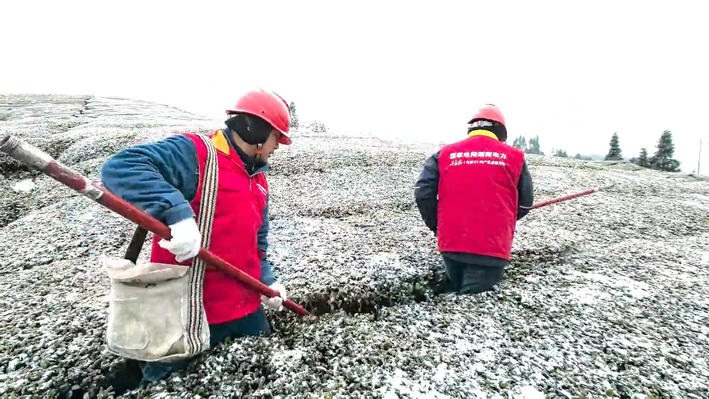 常德市石门县高海拔区域路面被积雪覆盖,国网常德供电公司组织“电骡子”共产党员服务队迎风踏雪开展线路设备特巡;湖南省电科院技术人员启用其自主研发的第二代操作杆式线路带电除冰装置,对山区覆冰线路开展现场作业。