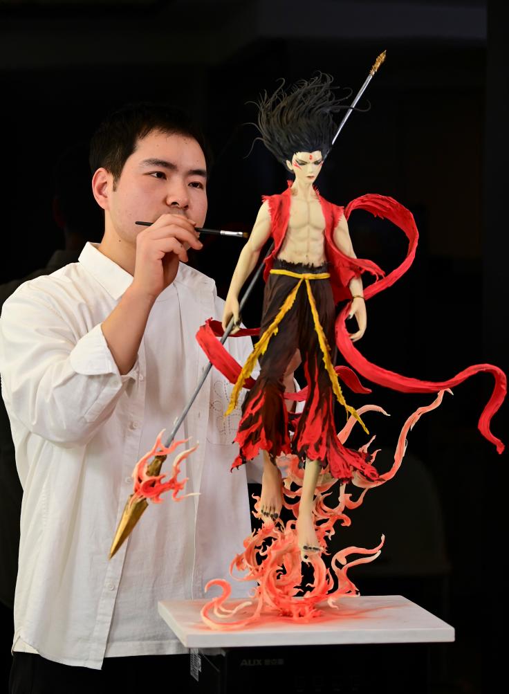 1月13日,张勃在为糖艺作品《哪吒》上色。新华社记者 邹竞一 摄