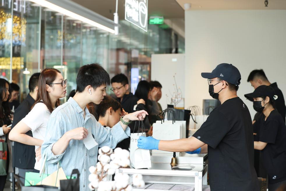 连锁茶饮品牌喜茶北京世纪金源购物中心门店内,店员正在为顾客打包产品。(受访者供图)