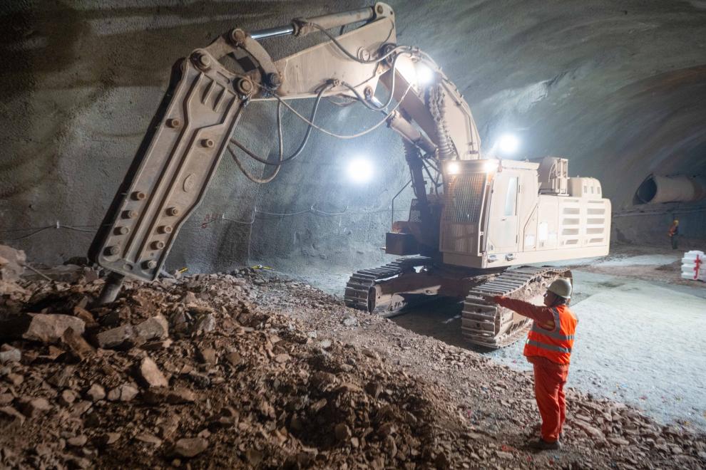 1月23日,工人指挥大型机械在成渝中线高铁人和隧道建设现场施工作业。新华社记者 唐奕 摄