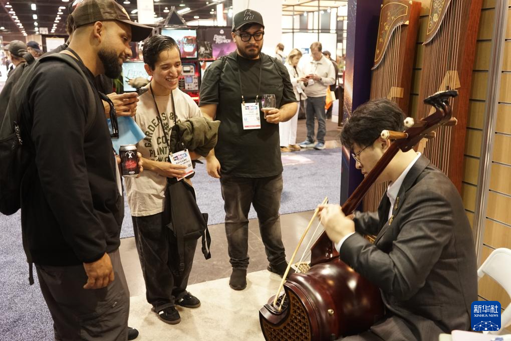 1月22日,在美国加利福尼亚州阿纳海姆会展中心,参观者在上海民族乐器一厂展位驻足。 新华社发(曾慧摄)