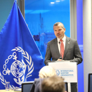 1月23日,国际海事组织秘书长多明戈斯在位于英国伦敦的国际海事组织总部召开记者会。新华社发(国际海事组织供图)