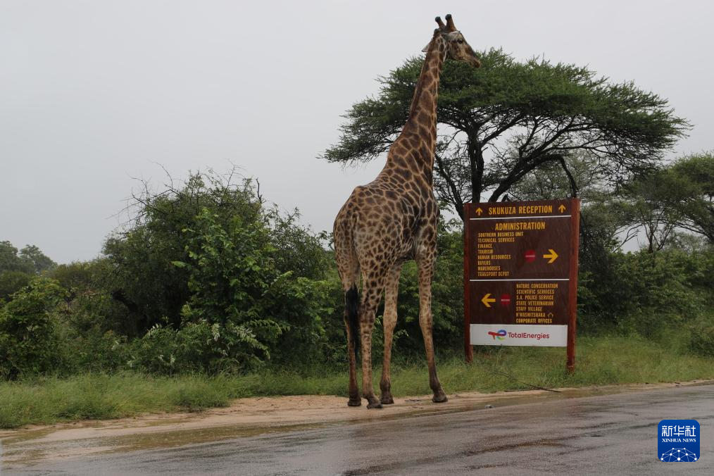 1月23日,在南非克鲁格国家公园,一只长颈鹿走在洪水退去的道路旁。新华社发(南非国家公园管理局供图)