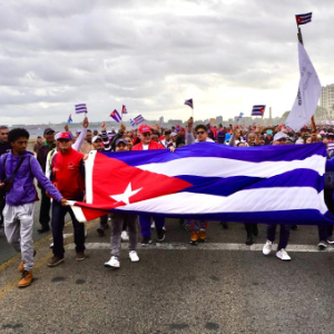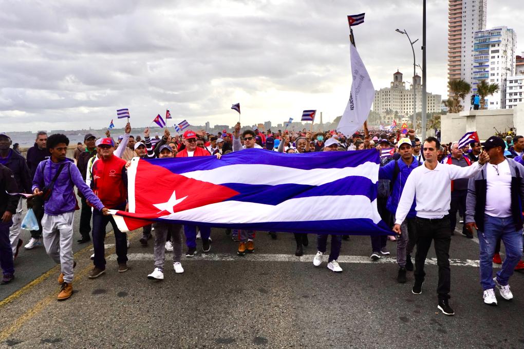 1月16日,在古巴首都哈瓦那,民众手持古巴国旗在美国驻古巴大使馆前举行反美游行。新华社记者蒋彪摄
