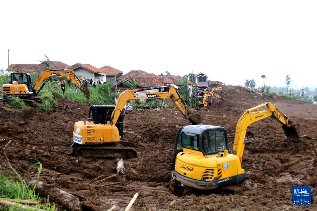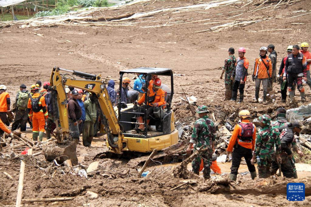 1月25日,在印度尼西亚西爪哇省西万隆县,救援人员在山体滑坡现场工作。新华社发(塞提安贾尔摄)