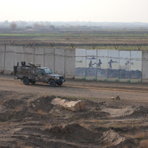 行驶近7个小时后,车辆抵达边境城市加伊姆,在一处哨所前停下。我被允许登上附近的一处高地。放眼望去,涂刷成伊拉克国旗配色的哨塔间隔排列,一道水泥边境墙连绵延伸,墙内侧还有一道平行的铁丝网,用于防止翻越的金属倒刺在阳光下闪着寒光。全副武装的伊军士兵分布于岗楼哨卡,军车不时往来,卷起尘土。远处,伊拉克和叙利亚两国国旗在边境线两侧比肩而立。