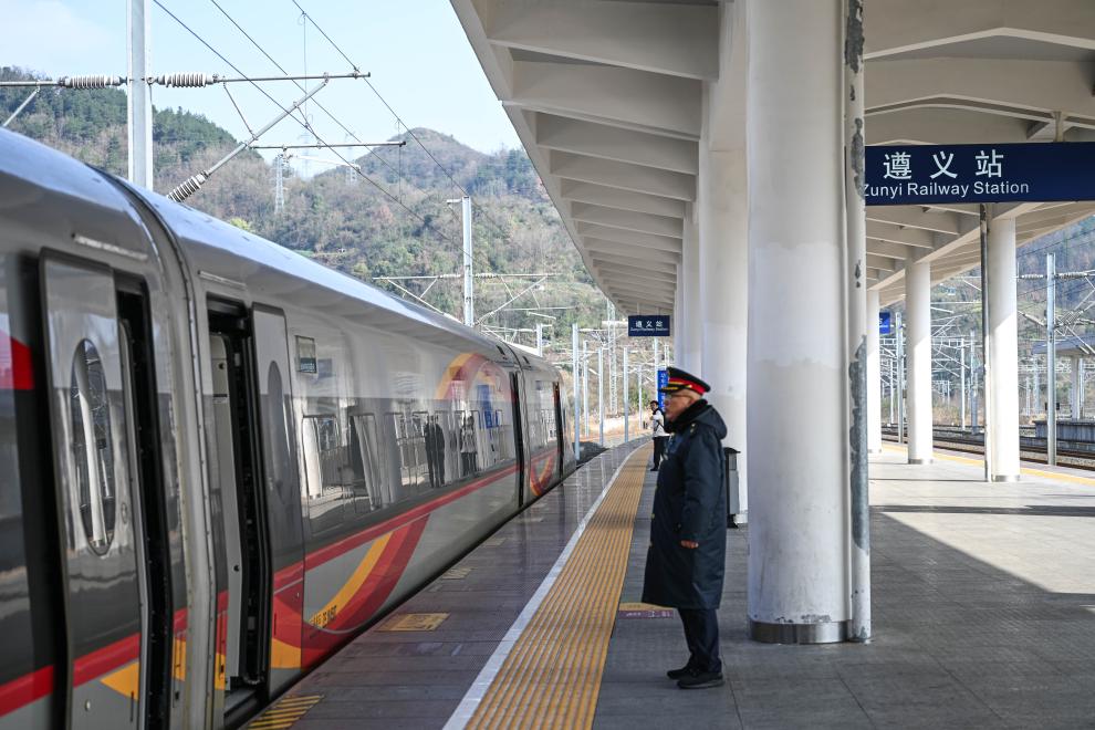 1月26日,贵州遵义开往延安方向的G3360次列车停靠在遵义站站台。新华社记者 杨文斌 摄