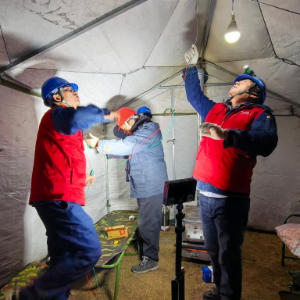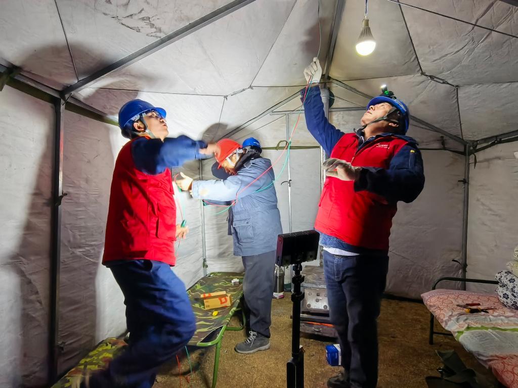 1月26日晚,国网甘南供电公司工作人员为临时安置点应急帐篷接电。(国网甘南供电公司供图)