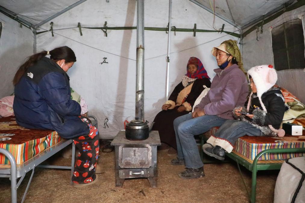 1月26日晚,在甘南州迭部县电尕镇哇曲村临时安置点,群众在应急帐篷内取暖休息。 (新华社记者张智敏 摄)