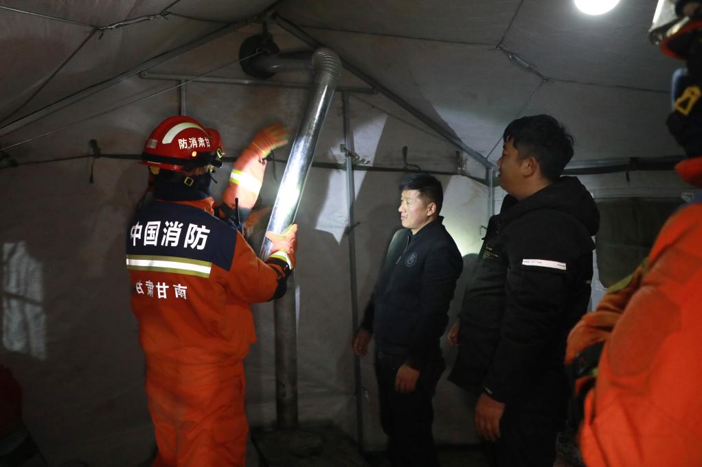 1月26日晚,在甘南州迭部县电尕镇哇曲村临时安置点,消防救援人员在应急帐篷内帮助群众安装煤炉烟筒。 (新华社记者张智敏 摄)