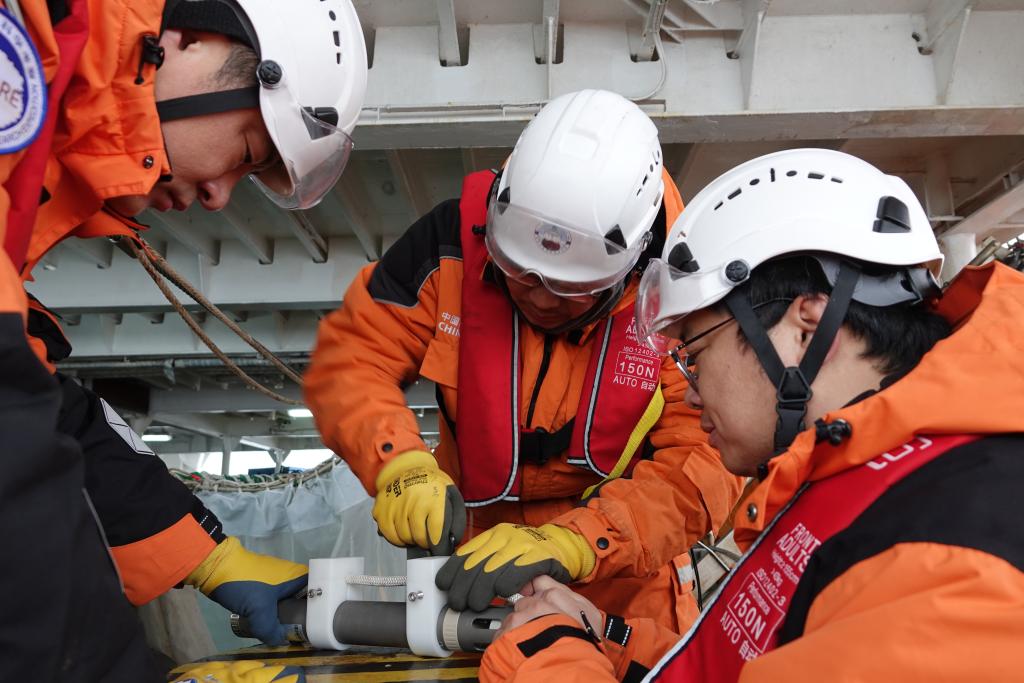 船时2026年1月26日凌晨,“雪龙”号大洋队队员曾定勇(中)与队友韩哲一(右)、宋德海正在连接潜标上的观测仪器。新华社记者顾天成 摄