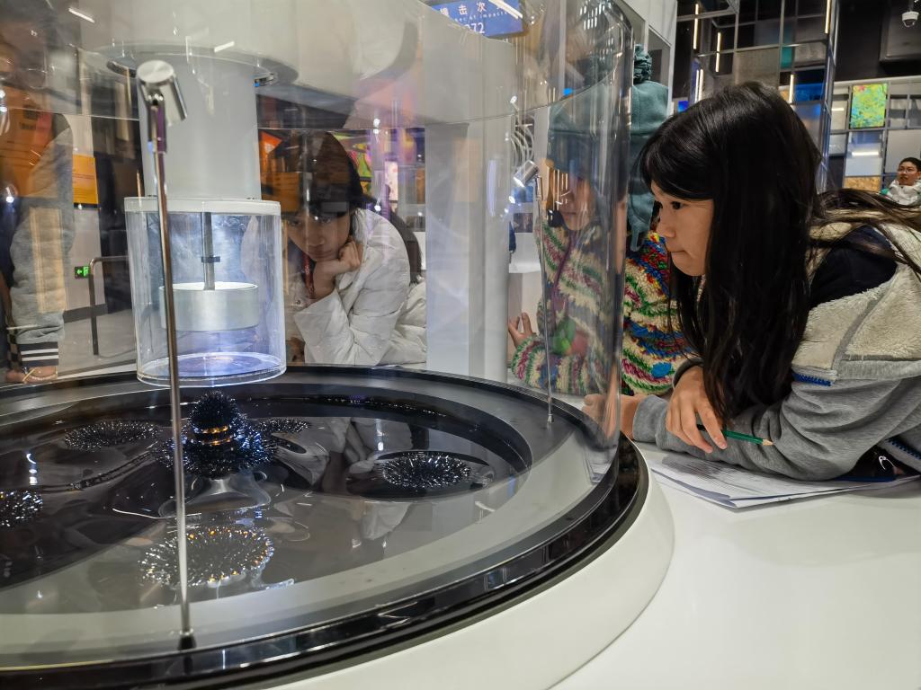 1月27日,观众在上海科技馆“材料魔方”展区通过“磁流体芭蕾”了解带有磁性的流体材料。新华社记者 陈爱平 摄