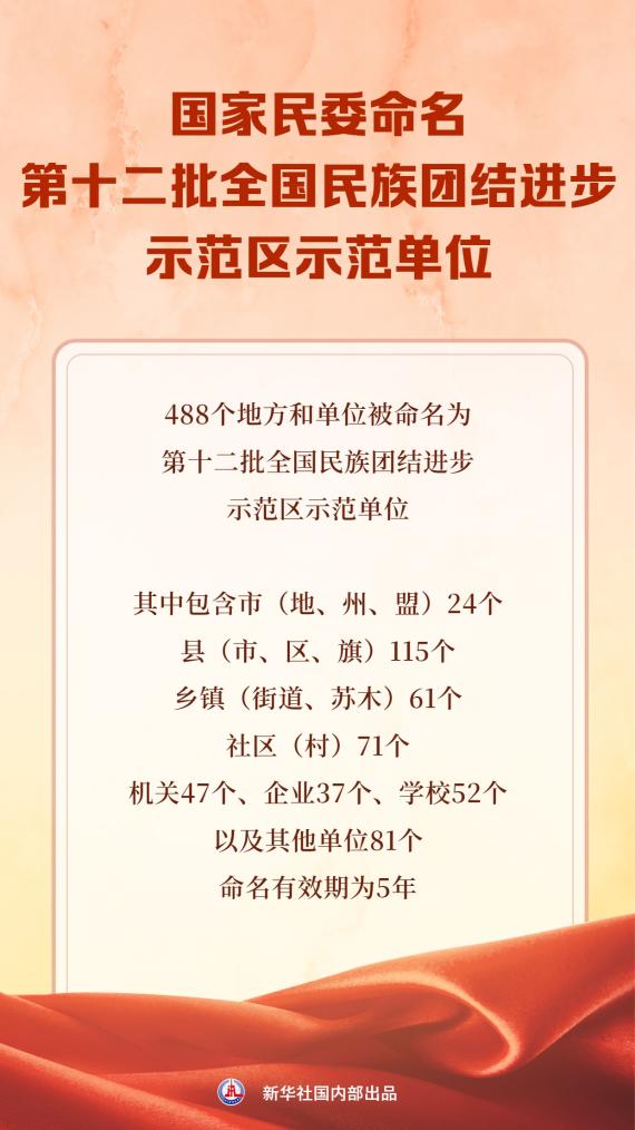记者从1月29日在京召开的全国民委主任会议获悉,488个地方和单位被命名为第十二批全国民族团结进步示范区示范单位。