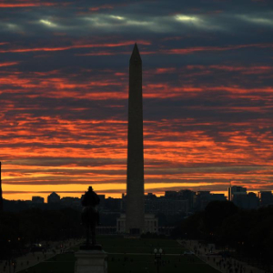 这是2025年10月15日拍摄的日落时分的美国华盛顿纪念碑。新华社记者李睿摄