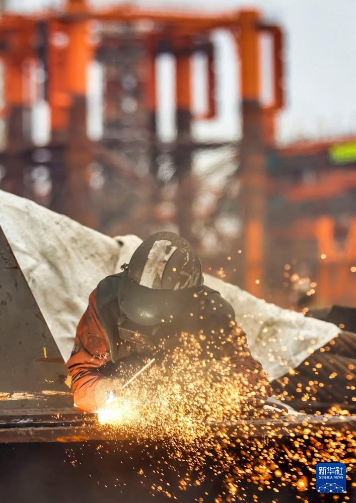 1月29日,在天津市滨海新区,海上油气平台建设工人进行现场施工。