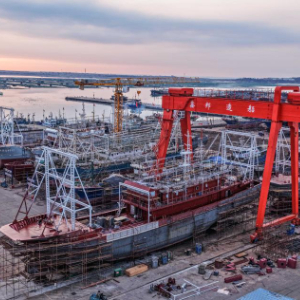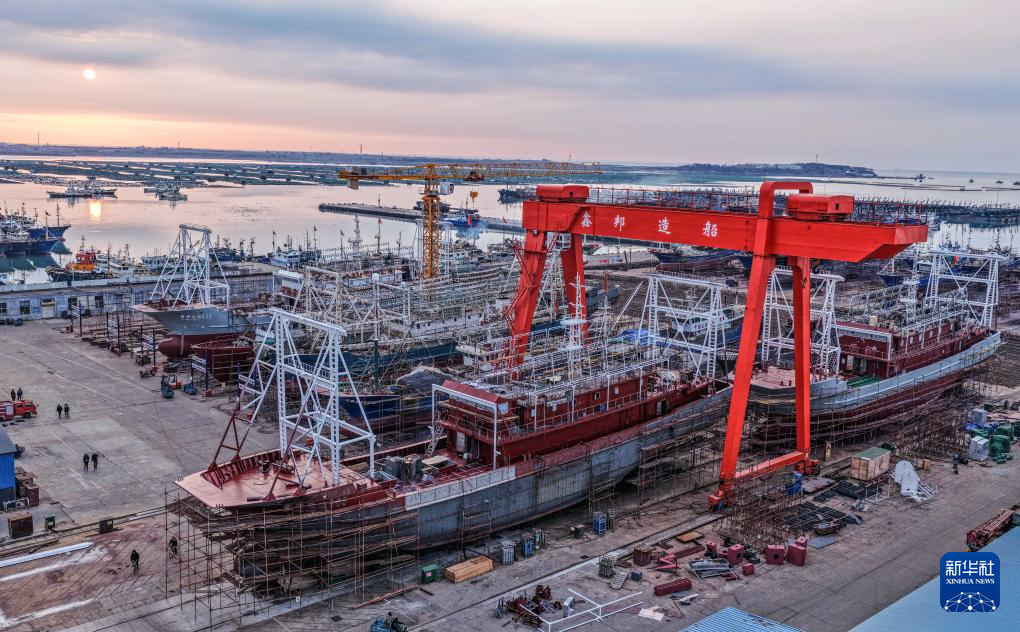 1月28日,在山东省荣成市石岛管理区海工装备产业基地,船舶在维修中(无人机照片)。