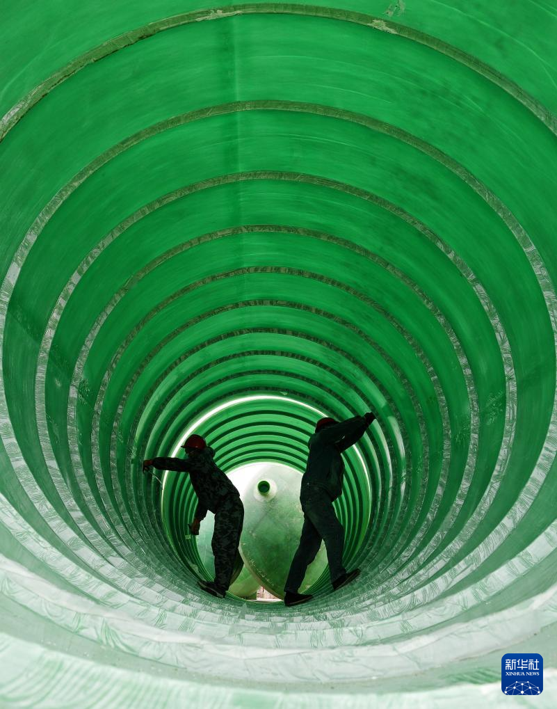 1月28日,在位于江苏省海安市南莫镇的江苏五水环境工程有限公司,工人赶制玻璃钢污水处理设备。