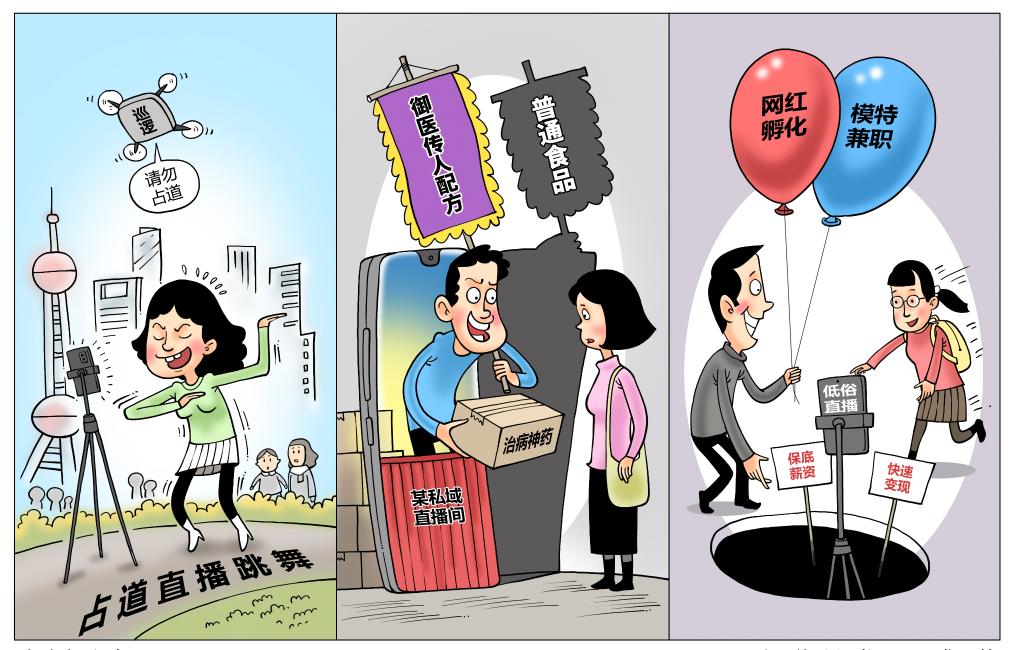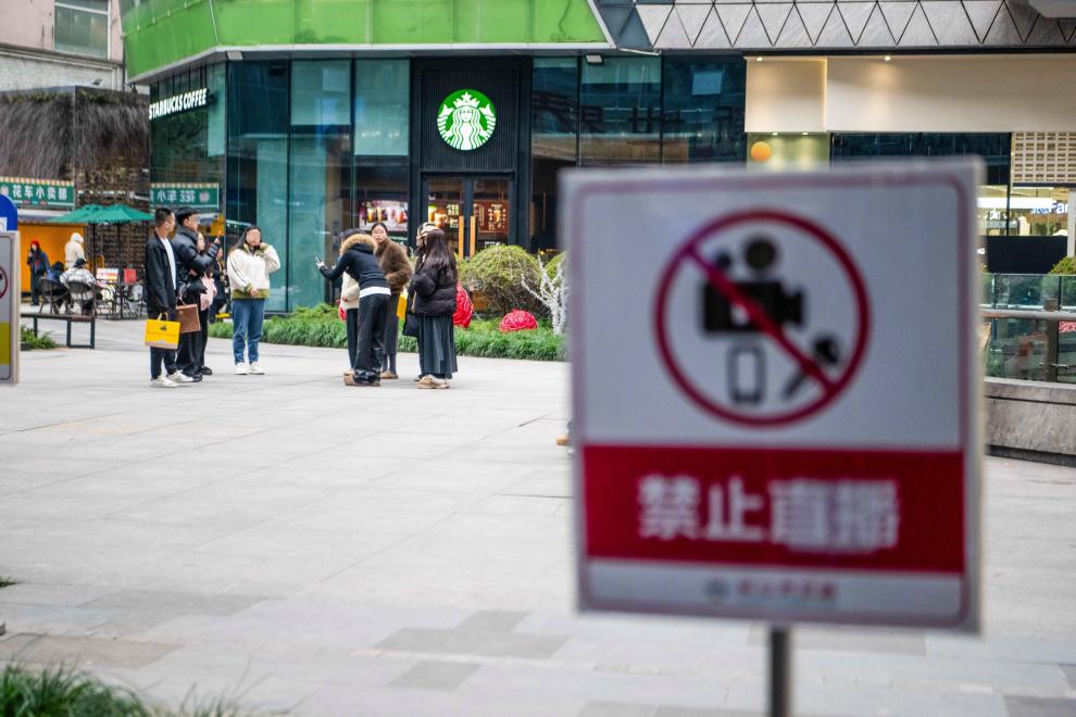 1月24日,在重庆市观音桥商圈,主播无视禁止标识进行直播。
