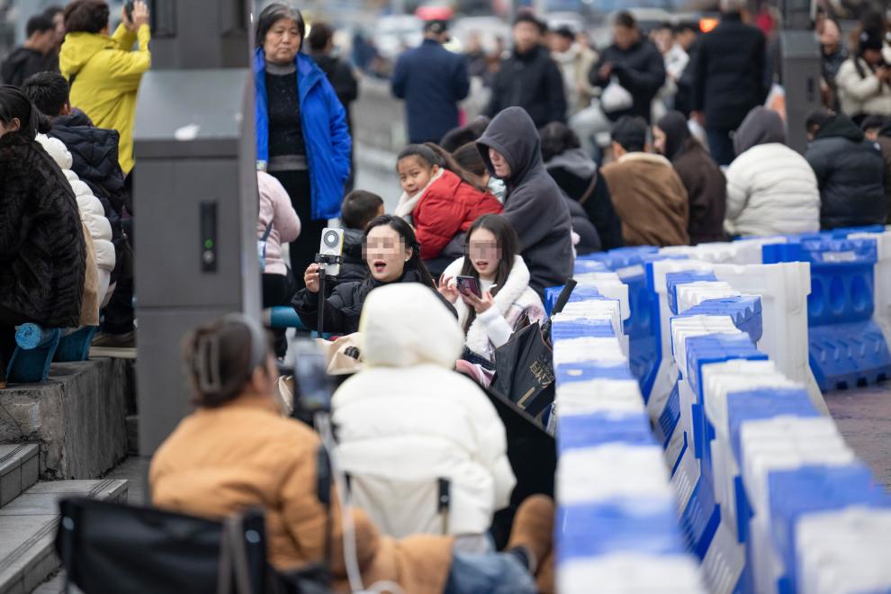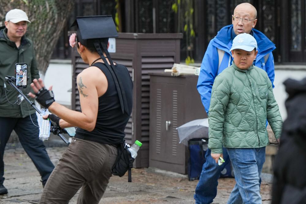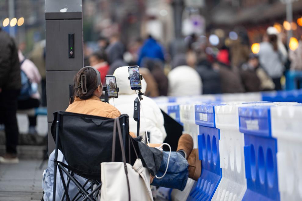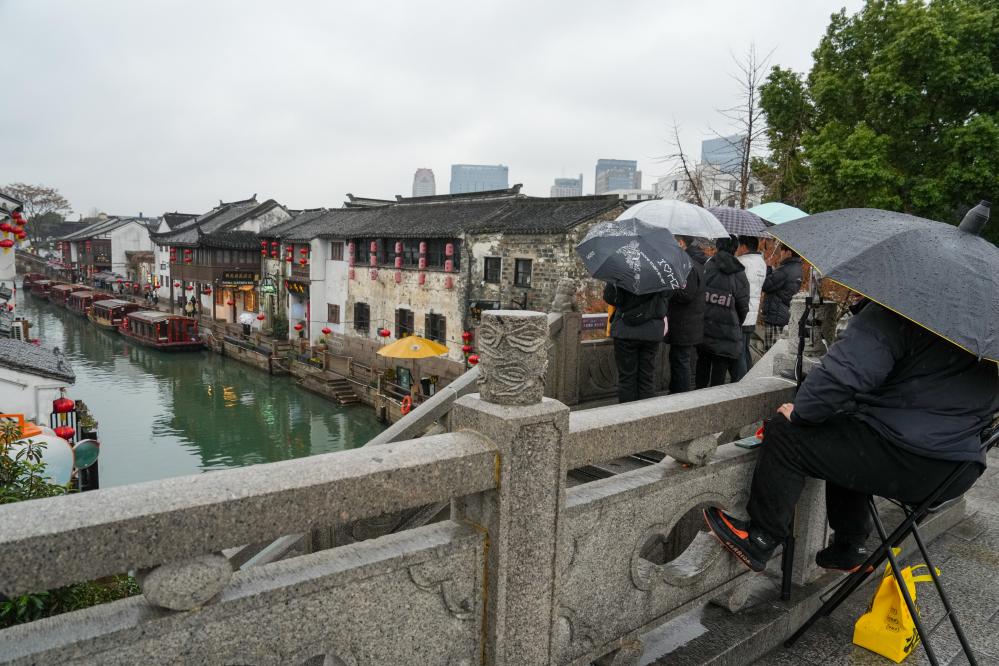 1月26日,在苏州市山塘街,一名主播(右一)携带折叠椅、直播器材长期占据最佳拍摄位置进行直播。