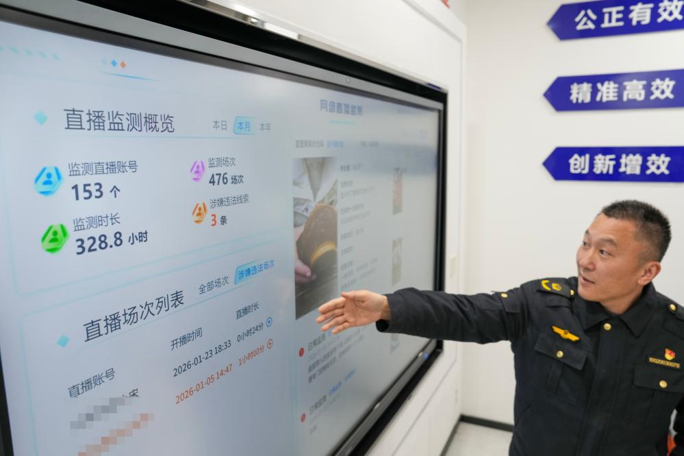 1月26日,在无锡市市场监督管理局网监处,工作人员展示通过“锡网云监”平台监测捕捉到的涉嫌违法线索,直播信息涉及虚假宣传、仿冒侵权等行为。