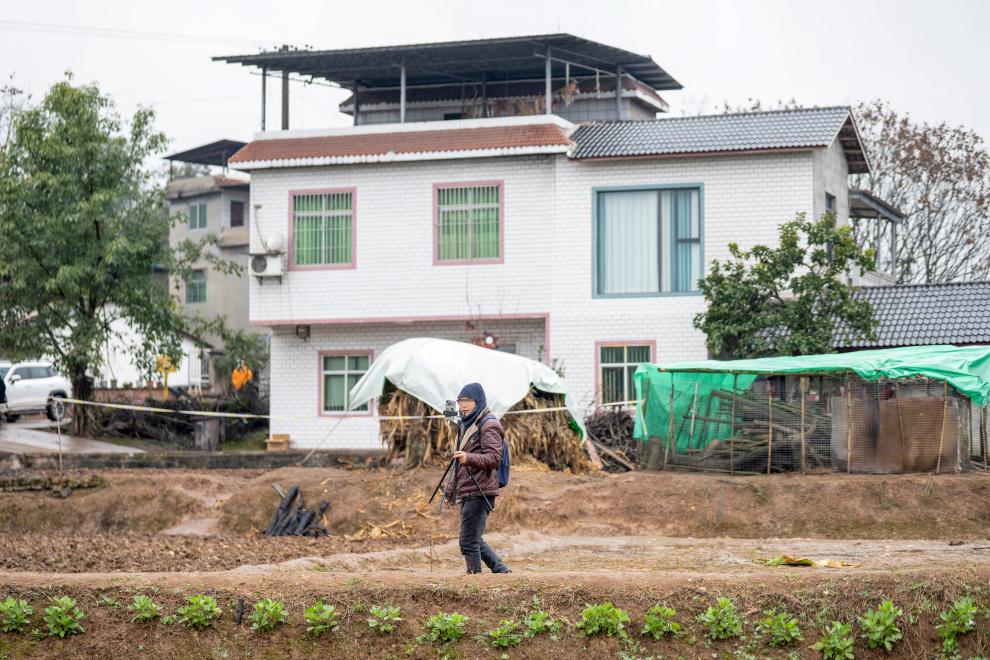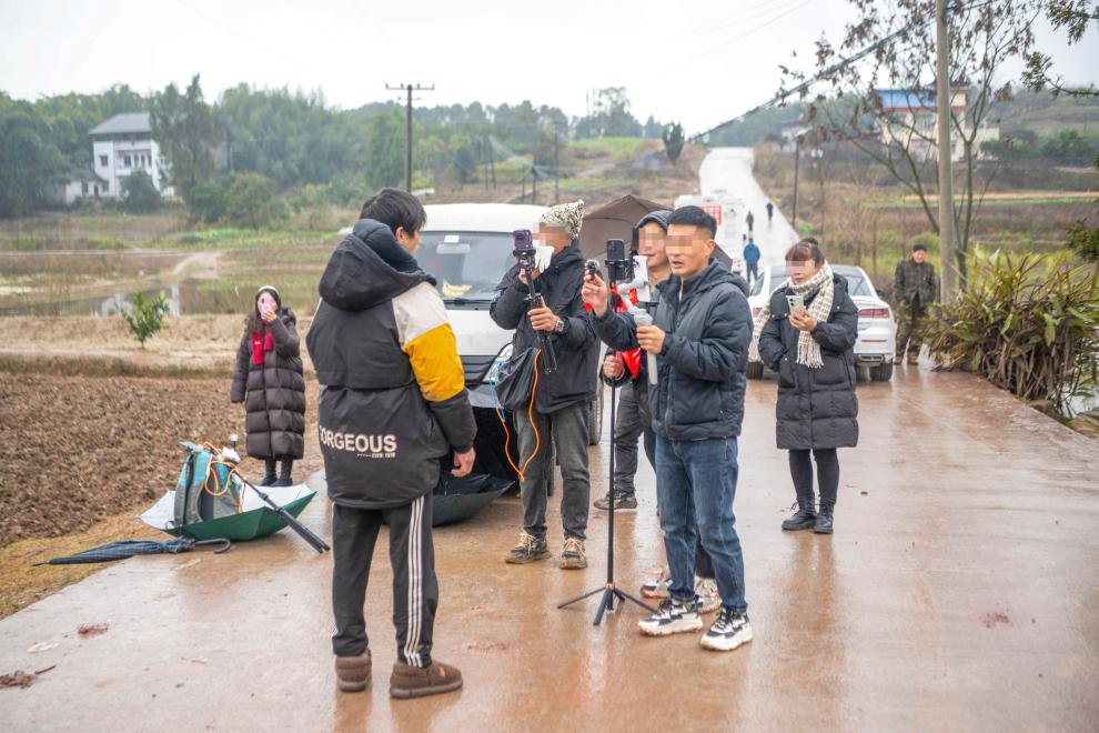 1月20日,在重庆市合川区云门街道庆福村,主播聚集在“呆呆”家门口进行直播。
