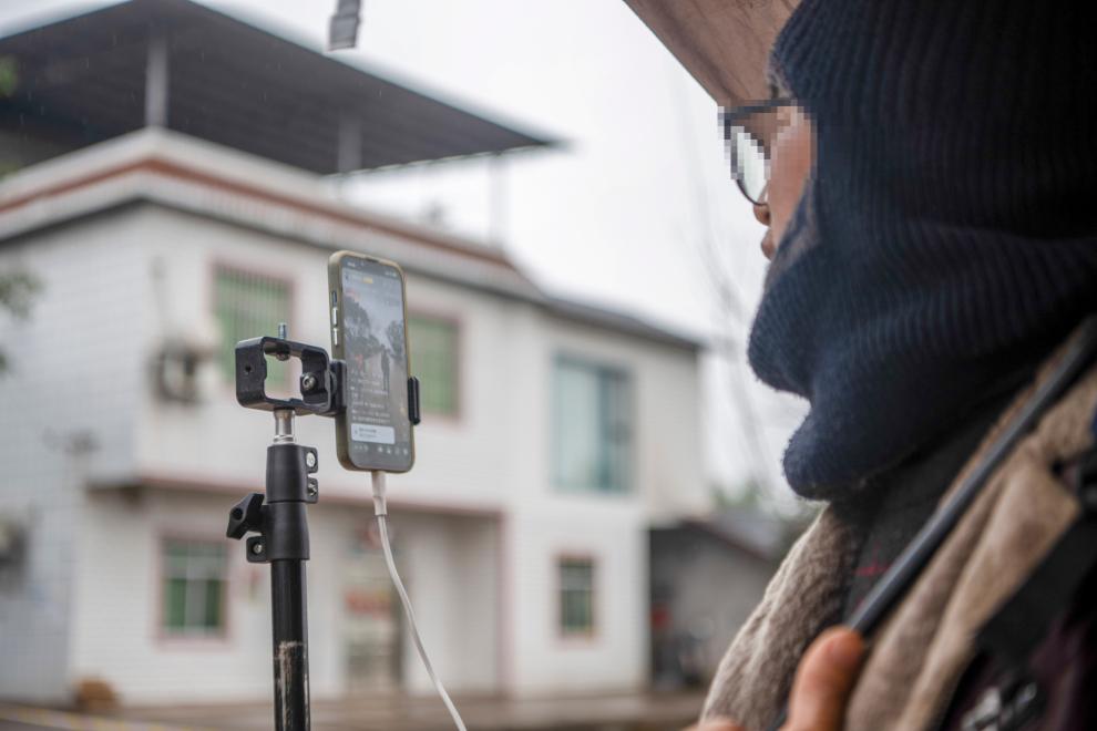 1月20日,在重庆市合川区云门街道庆福村,主播在“呆呆”家门口进行直播。