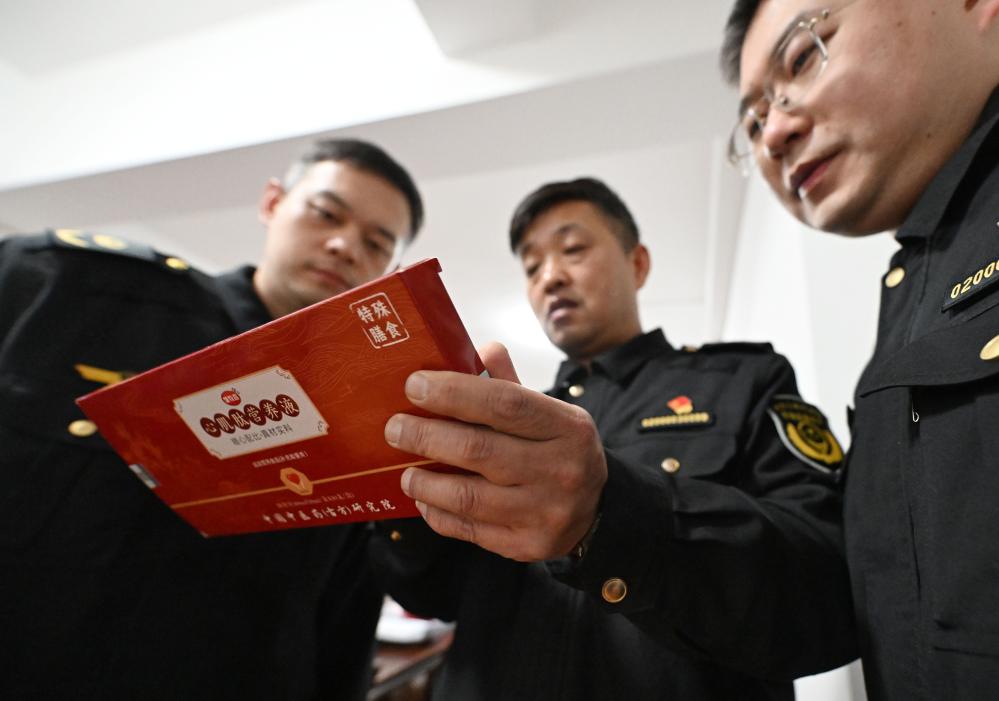1月23日,天津市市场监管综合行政执法总队工作人员在查看涉案的直播间产品。