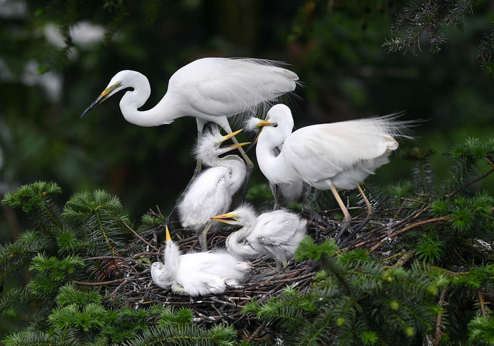 在江西省南昌市新建区象山森林公园,白鹭正在给雏鸟喂食(2021年5月18日摄)。新华社记者 万象 摄