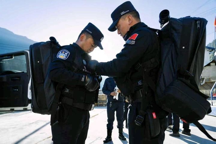 派出所大院里,队伍已整装待发。教导员陈善良吹响口哨,民警们高亢的口号声随之划破晨雾。登山绳被重新收紧打结,背包带一一勒实,金属扣环相互碰撞,发出利落的脆响。民警更丁丁久将一卷红绳仔细绕好,塞进背包外侧。整个装备包重十多公斤。