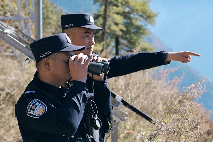 这是吉隆边境派出所移民管理警察在巡边路上观察前方情况。新华社记者 周昱龙 摄