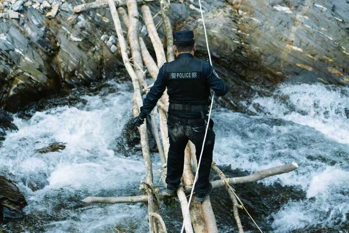 教导员陈善良告诉我:“在密林深处的‘白崖’路段,更难走!那里坡度接近80度,脚下的山体也几乎垂直。我们需要一名民警先快速越过险段,在对侧固定登山绳,其余人员依次拽绳前行。”