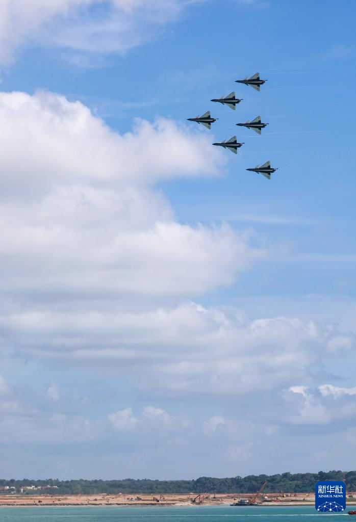 当天11时许,6架歼-10表演机在樟宜机场停机坪分2批依次起飞,在空中集合编组后,飞往海面上空,展开空中特技动作飞行。