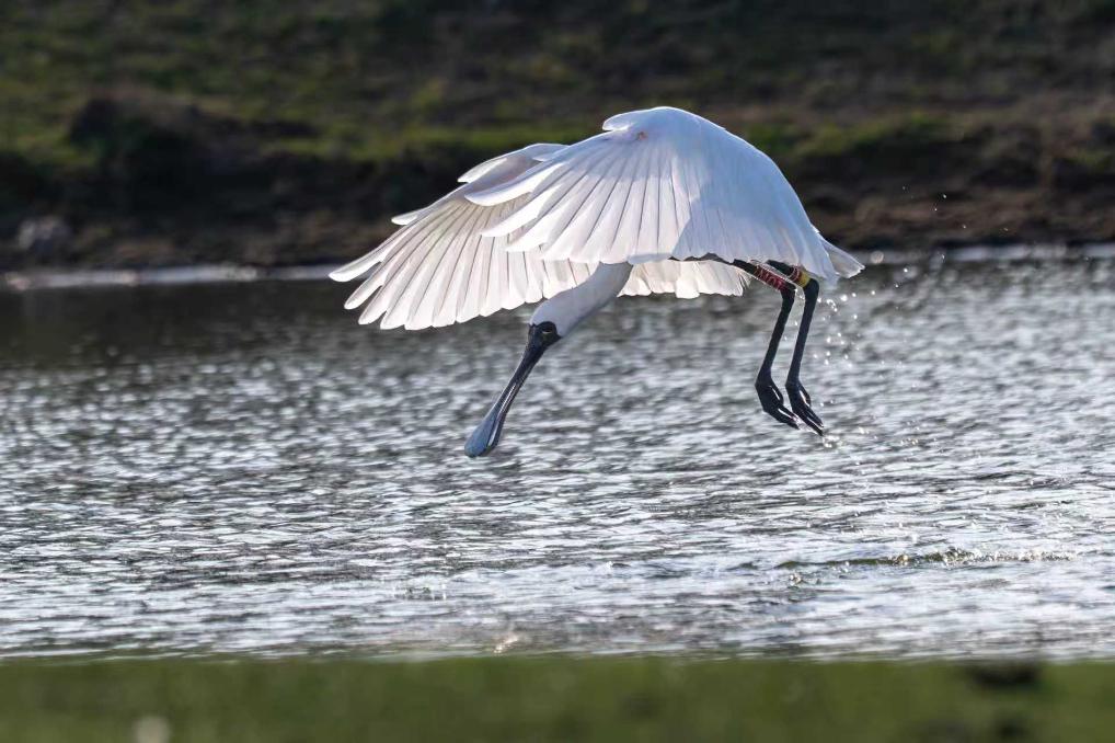 编号“M01”的黑脸琵鹭准备落地。新华社发(张玉霞 摄)