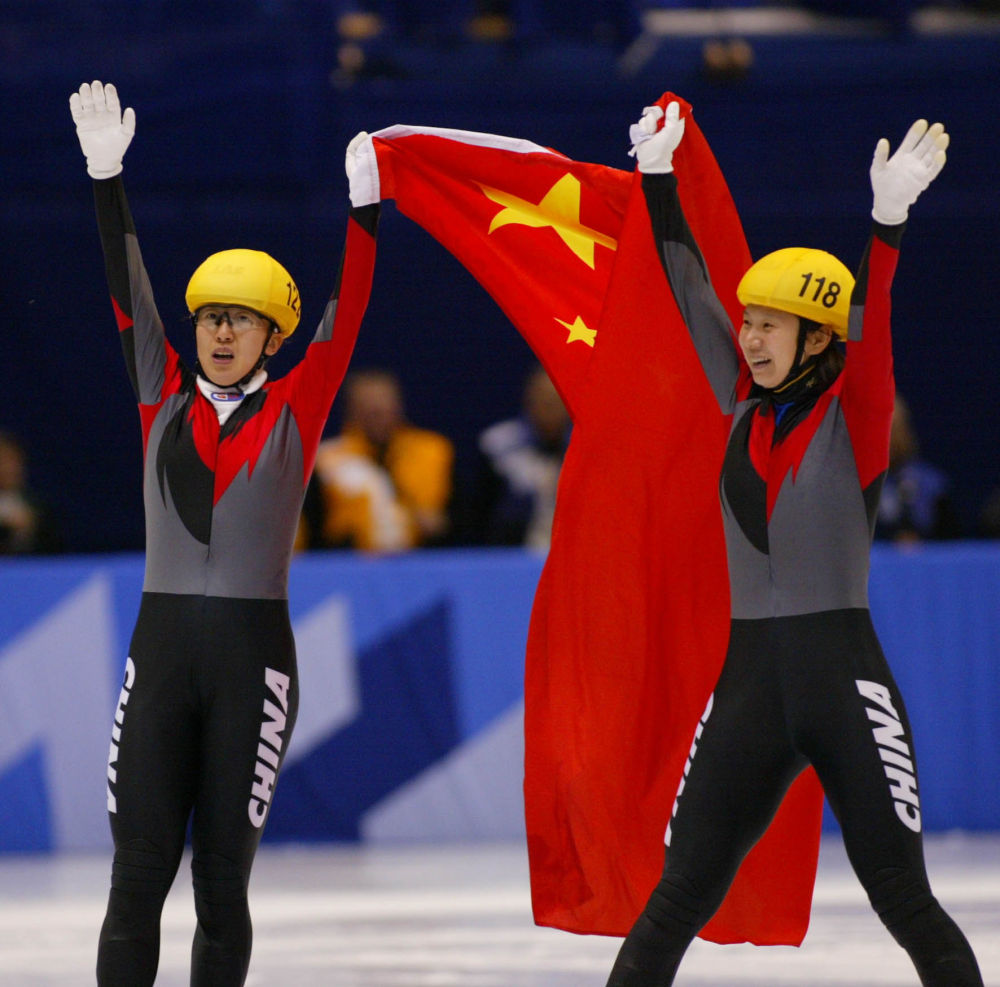 ↑2002年2月16日,杨扬(左)和王春露在盐湖城冬奥会短道速滑女子500米决赛后庆祝。