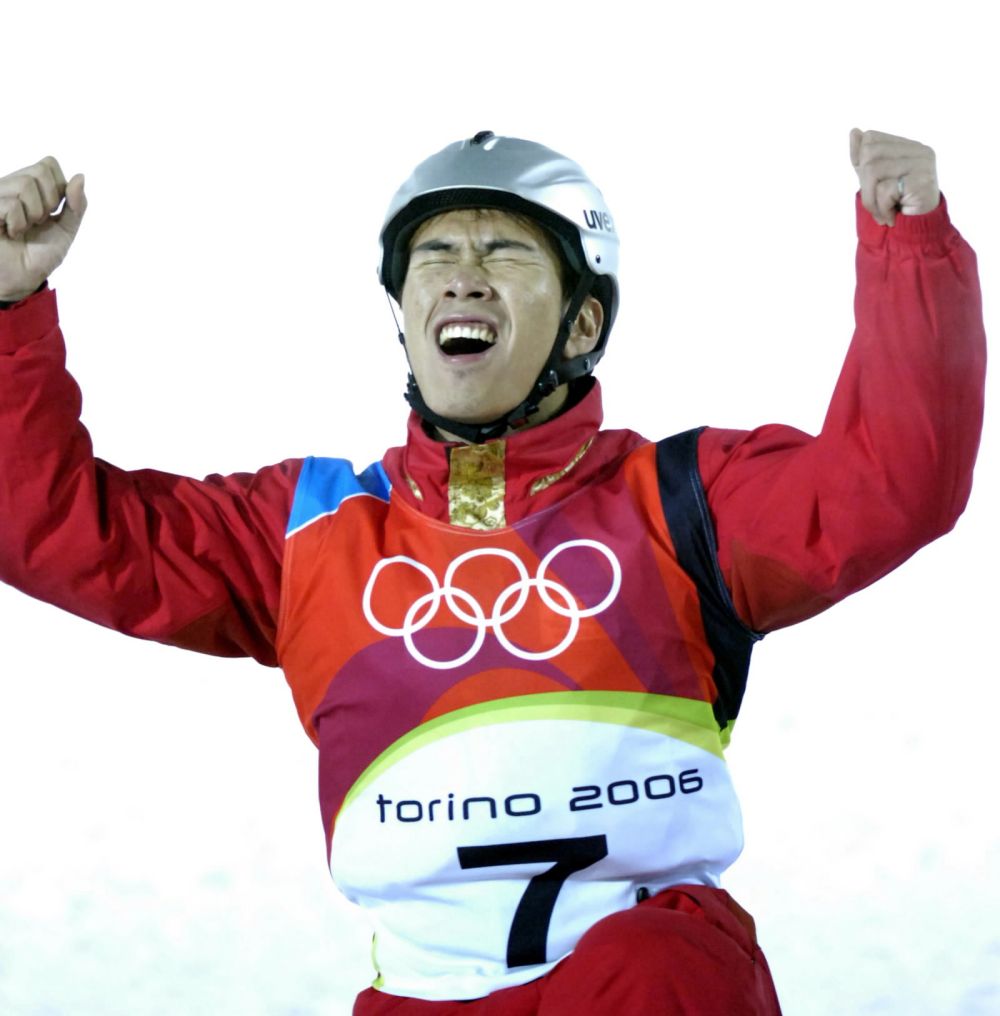 ↑2006年2月23日,韩晓鹏在都灵冬奥会自由式滑雪男子空中技巧比赛中夺得金牌。