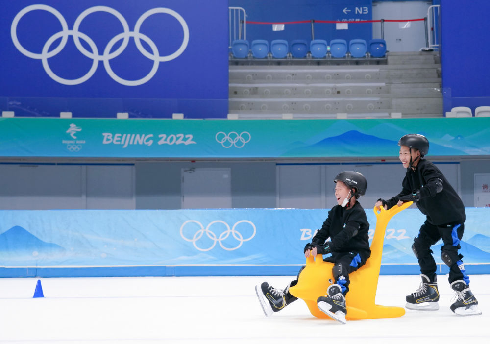 ↑2022年10月2日,小朋友们在国家速滑馆体验滑冰。