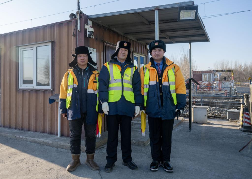 2月1日,通让线27公里道口工长徐中成(左二)与工友们在道口值班室前合影。新华社记者连振 摄