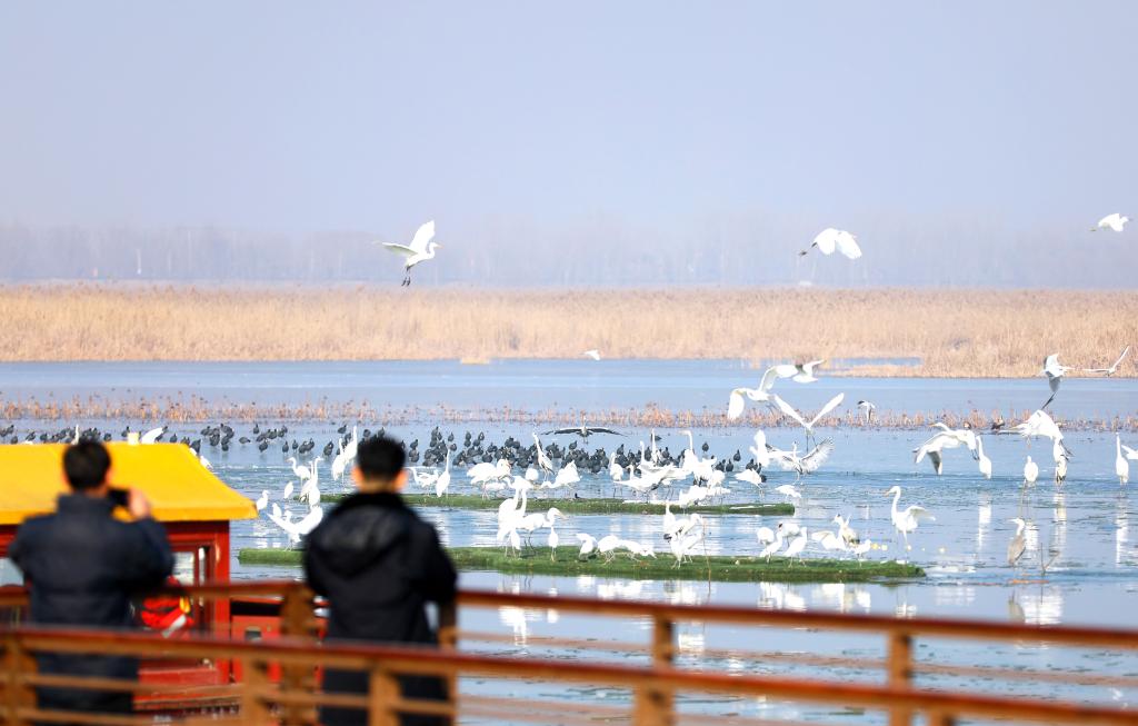 游客们正欣赏着白鹭翔集。 新华社发