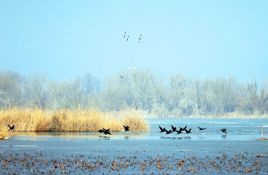 鸬鹚在衡水湖的冰面上空低飞。 新华社发