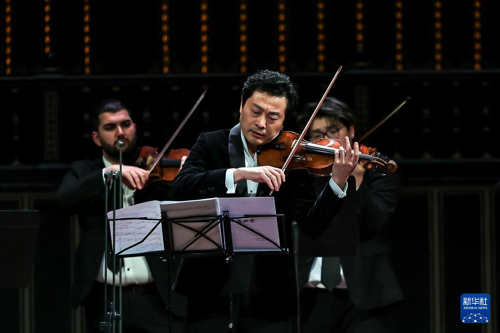 2月2日,在匈牙利首都布达佩斯,中国小提琴演奏家吕思清(中)在音乐会上演奏。新华社发(鲍洛格·达维德摄)