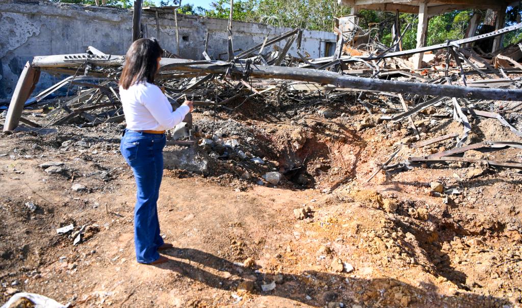 1月19日,在委内瑞拉米兰达州的委内瑞拉科学研究院,工作人员查看美国军事行动留下的弹坑。新华社记者丁洪法摄