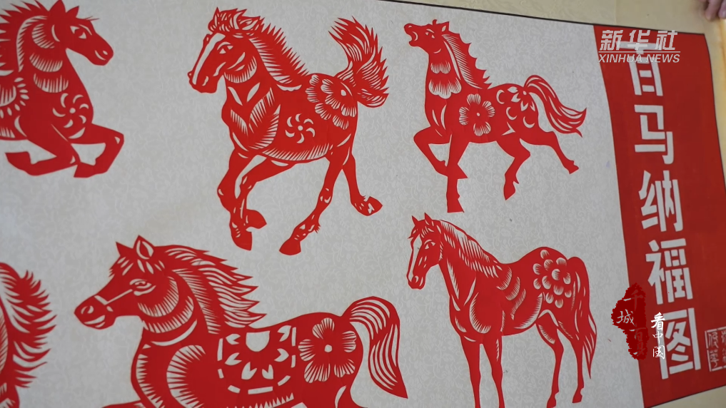 当地剪纸手工艺人刘俊华带领学生精心创作了12米剪纸长卷《百马纳福图》,百匹姿态各异的骏马融入云纹、葫芦纹等传统吉祥纹饰,传递出新春的吉祥瑞气。