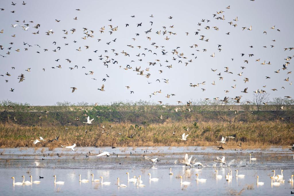 候鸟在上海崇明东滩鸟类国家级自然保护区飞翔(1月23日摄)。