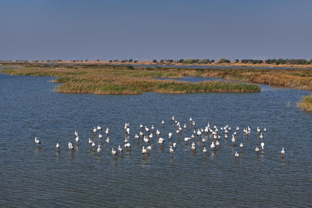 黑脸琵鹭在上海崇明东滩鸟类国家级自然保护区栖息(2023年5月14日摄)。