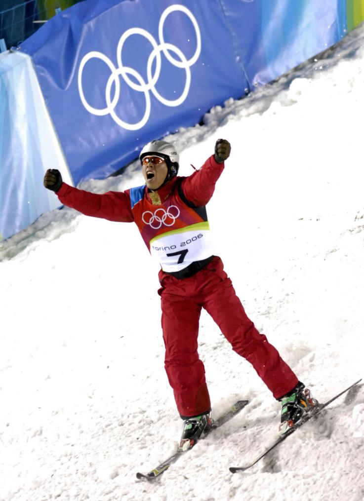 韩晓鹏在都灵冬奥会上完成动作后欢呼。 新华社记者 王长山 摄