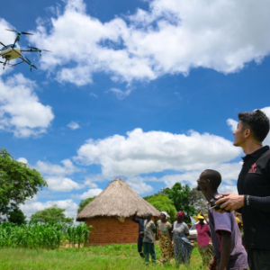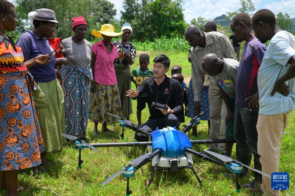 1月26日,在津巴布韦中马绍纳兰省沙姆瓦地区津迪村,中国援津第四期高级农业专家组专家马登荣(中)为村民讲解农用无人机。新华社记者 杨光 摄